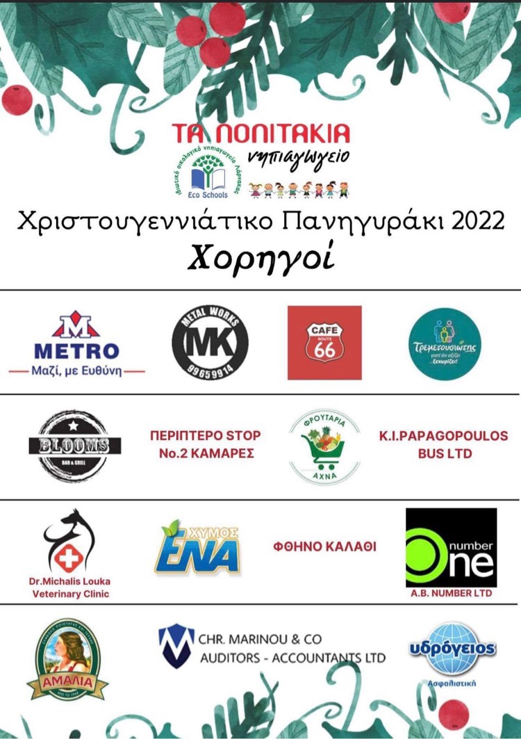 Την Παρασκευή 9/12/2022 στις 5:30 φορέστε την πιο γιορτινή σας διάθεση και σας περιμένουμε. Αυτή τη μαγική βραδιά θα γίνει η φωταγώγηση του νηπιαγωγείου μας από τον δήμαρχο Λάρνακας Ανδρέα Βύρα. Φυσικά δε θα μπορούσε να λείπει ο Άγιος Βασίλης όπου θα κάνει εντυπωσιακή είσοδο και θα μοιράσει δώρα στα παιδιά! Θα υπάρχουν διάφορα νόστιμα εδέσματα, ζεστά κάστανα, ζεστά ροφήματα, αλκοολούχα ποτά.