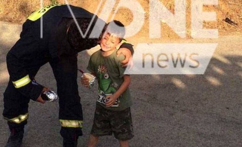 Ένα παιδάκι μοιράζει σάντουιτς σε πυροσβέστες στο Σινά Όρος που δεν σιτίστηκαν για ώρες