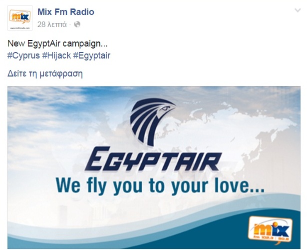 Χαμός προκλήθηκε στα social media, με τους Κύπριους χρήστες να σχολιάζουν με τον δικό τους τρόπο την αεροπειρατεία που εκδηλώθηκε χτες το πρωί σε αεροπλάνο της Egypt Air, το οποίο έκανε αναγκαστική προσγείωση στο Αεροδρόμιο Λάρνακας.