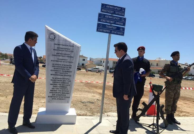 Σε χαιρετισμό του ο Υπουργός Αμυνας Χριστόφορος Φωκαϊδης ανέφερε πως «η ονοματοδοσία των τριών οδών υπηρετεί το στόχο  μαζί με την έκφραση της εκτίμησης, του σεβασμού και της ευγνωμοσύνης στους συγγενείς που ήρθαν από την Ελλάδα για την τελετή».