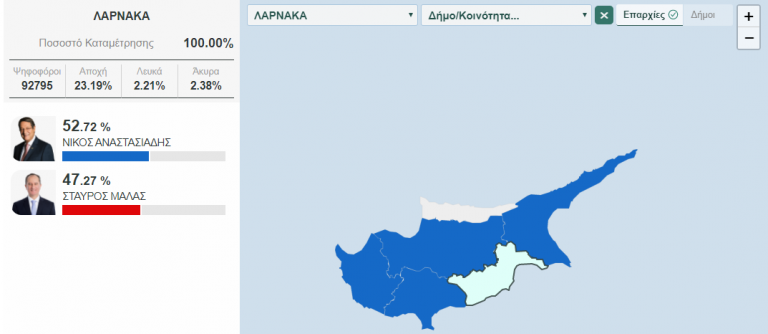 Ποσοστό 52.72% εξασφάλισε στη Λάρνακα ο Νίκος Αναστασιάδης, σε αντίθεση με τον κ. Μαλά ο οποίος έλαβε 47.27%.
