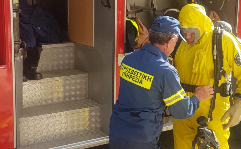 Στη σκηνή μετέβησαν ένα βυτιοφόρο όχημα και ένα όχημα επεξεργασίας χημικών της Πυροσβεστικής Υπηρεσίας. `Ανδρες της Πυροσβεστικής έκαναν αναγνώριση του υλικού με τη χρήση αναπνευστικών συσκευών και χημικών στολών.