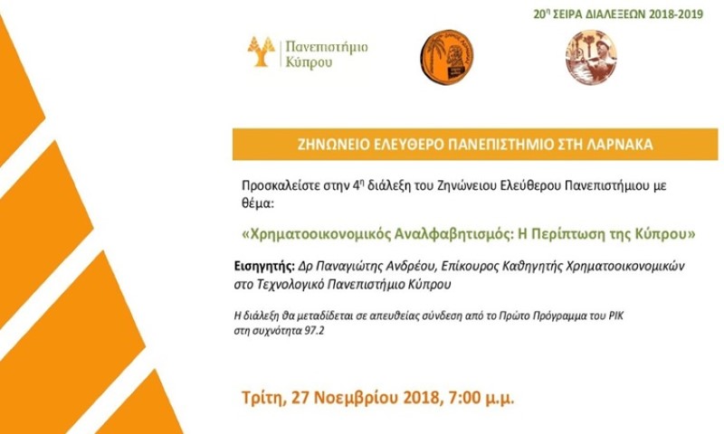 4η διάλεξη του Ζηνώνειου Ελεύθερου Πανεπιστήμιου με θέμα: «Χρηματοοικονομικός Αναλφαβητισμός: Η Περίπτωση της Κύπρου», την Τρίτη, 27 Νοεμβρίου στη Στέγη Γραμμάτων και Τεχνών, στις 7:00 μ.μ.