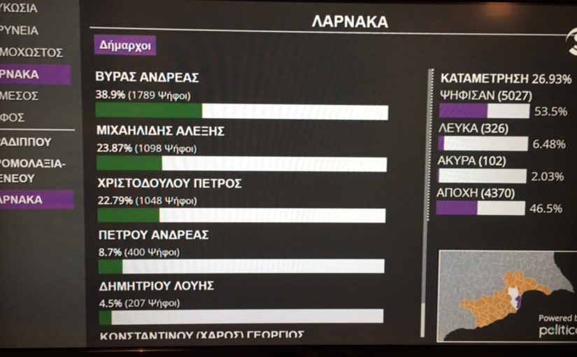 Σύμφωνα με τα στατιστικά της τηλεόρασης Sigma με την καταμέτρηση να φτάνει στο 42,5% ο κος Ανδρέας Βύρας φαίνεται να ξεχωρίζει στην κούρσα.