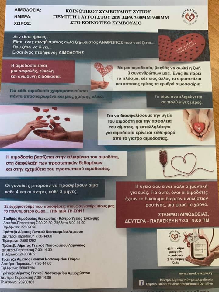 Το Κοινοτικό Συμβούλιο Ζυγίου, πραγματοποιεί στα γαφεία του αύριο Πέμπτη 1η Αυγούστου 2019, από τις 7.00 μ.μ. μέχρι και τις 9.00 μ.μ., εθελοντική αιμοδοσία.