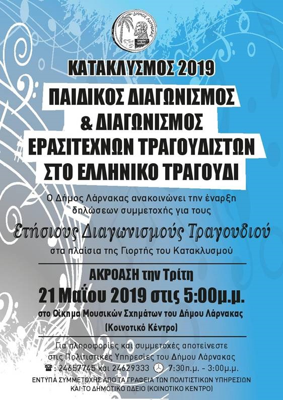 Η έναρξη δηλώσεων για συμμετοχή έχει αρχίσει στα πλαίσια της γιορτής του Κατακλυσμού 2019. Η ακρόαση θα γίνει την Τρίτη 21 Μαίου 2019 και ώρα 5.00 μ.μ. στο Οίκημα Μουσικών Σχημάτων του Δήμου Λάρνακας (Κοινοτικό Κέντρο).
