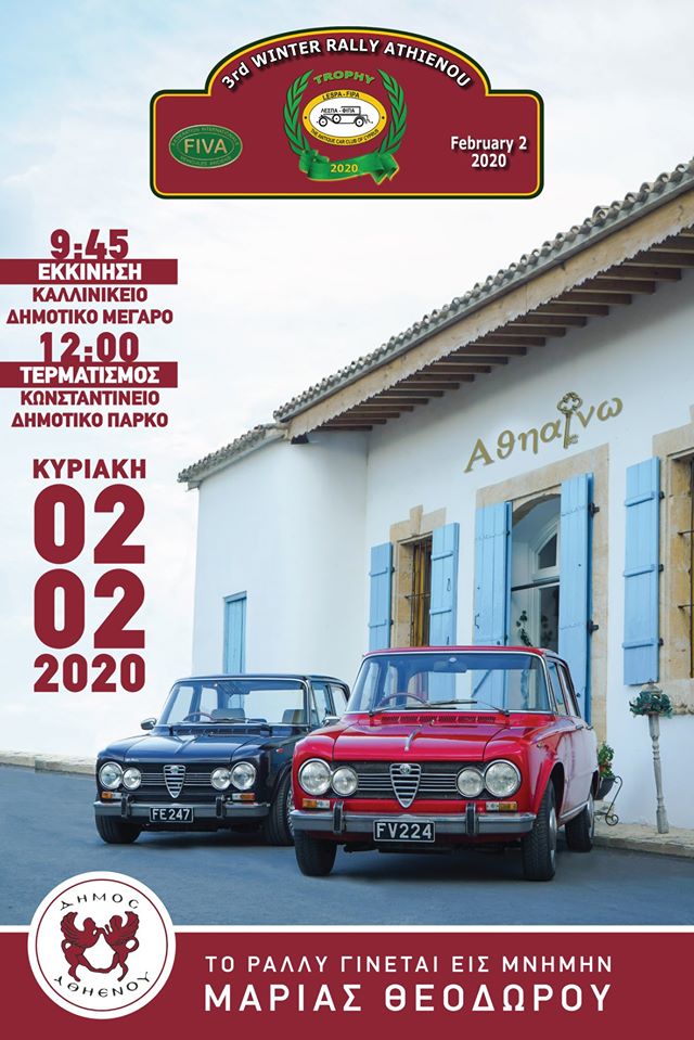 “Το καθιερωμένο πλέον Ράλλυ Αθηένου θα πραγματοποιηθεί για τρίτη συνεχόμενη χρονιά, την Κυριακή 2 Φεβρουαρίου 2020. Τα 100 κλασσικά αυτοκίνητα που θα διαγωνιστούν θα καλύψουν μια απόσταση 90 περίπου χιλιομέτρων.