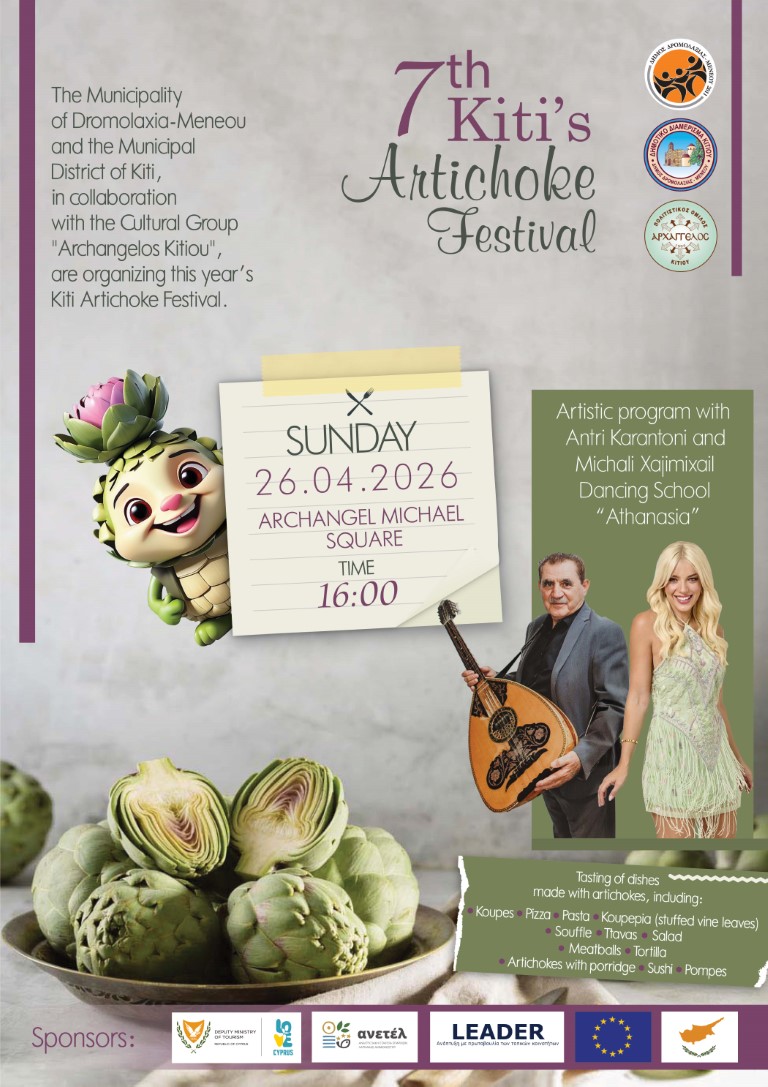 Ο Δήμος Δρομολαξιάς-Μενεού και το Δημοτικό Διαμέρισμα Κιτίου, σε συνεργασία με τον Πολιτιστικό Όμιλο «Αρχάγγελος» Κιτίου, σας προσκαλούν στο 7ο Φεστιβάλ Αγκινάρας!