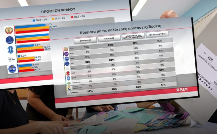 Το ΑΚΕΛ κατατάσσουν στην πρώτη θέση των επερχόμενων Βουλευτικών Εκλογών οι συμμετέχοντες στη νέα δημοσκόπηση που διενήργησε η εταιρεία Rai Consultants για λογαριασμό του Alpha Kύπρου. εντός του μηνός Φεβρουαρίου.