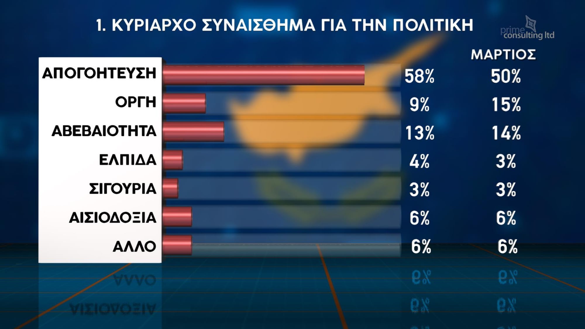 Κυρίαρχο συναίσθημα των πολιτών απέναντι στην πολιτική παραμένει η απογοήτευση, την οποία δηλώνει το 58% των ερωτηθέντων, αυξημένη από το 50% του Μαρτίου. Ακολουθούν η αβεβαιότητα με 13%, η οργή με 9%, η αισιοδοξία με 6%, ενώ μόλις 4% δηλώνει ελπίδα και 3% σιγουριά. Τα στοιχεία αυτά δείχνουν ότι το πολιτικό σύστημα εξακολουθεί να αντιμετωπίζει σοβαρό πρόβλημα εμπιστοσύνης.