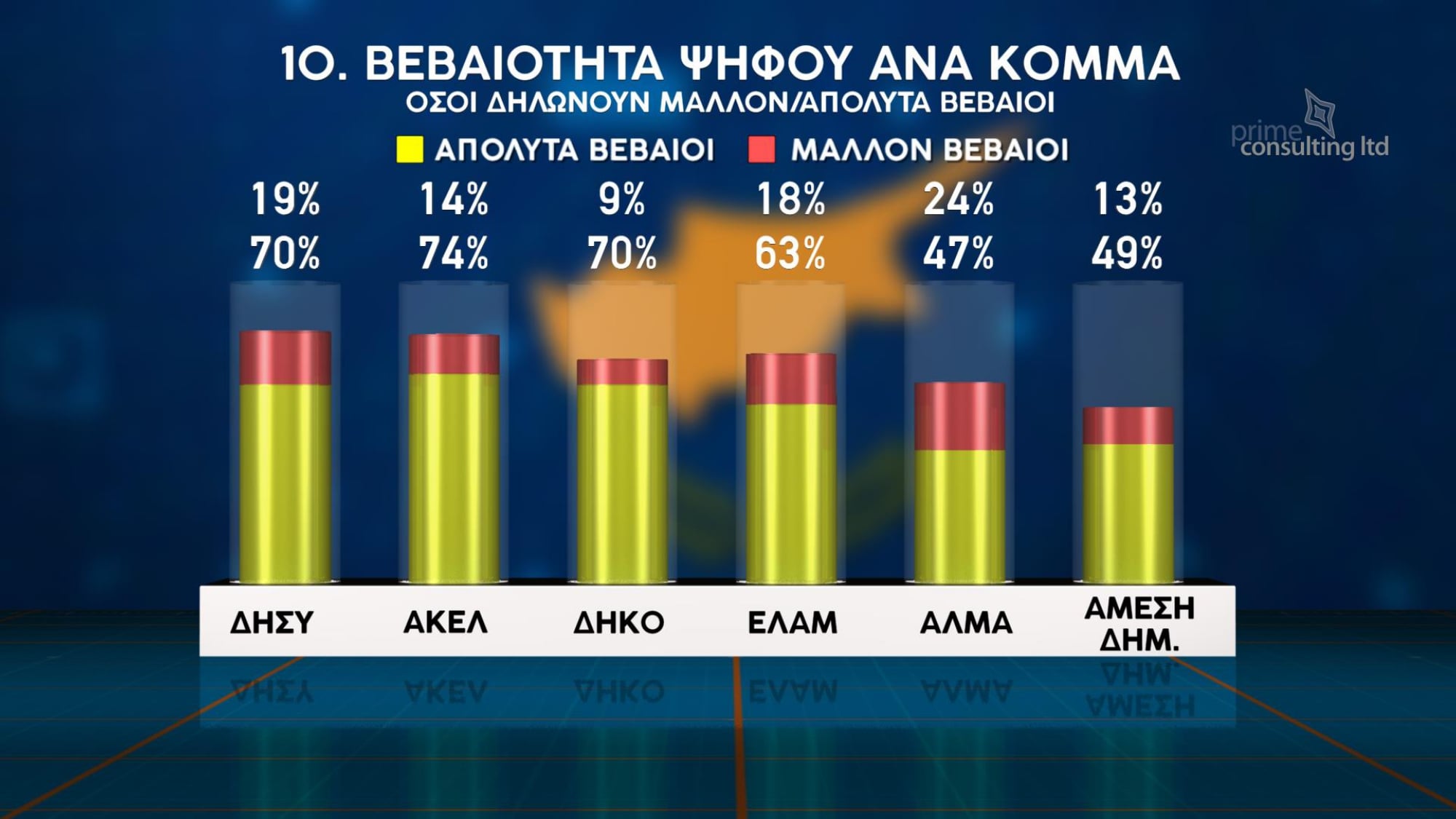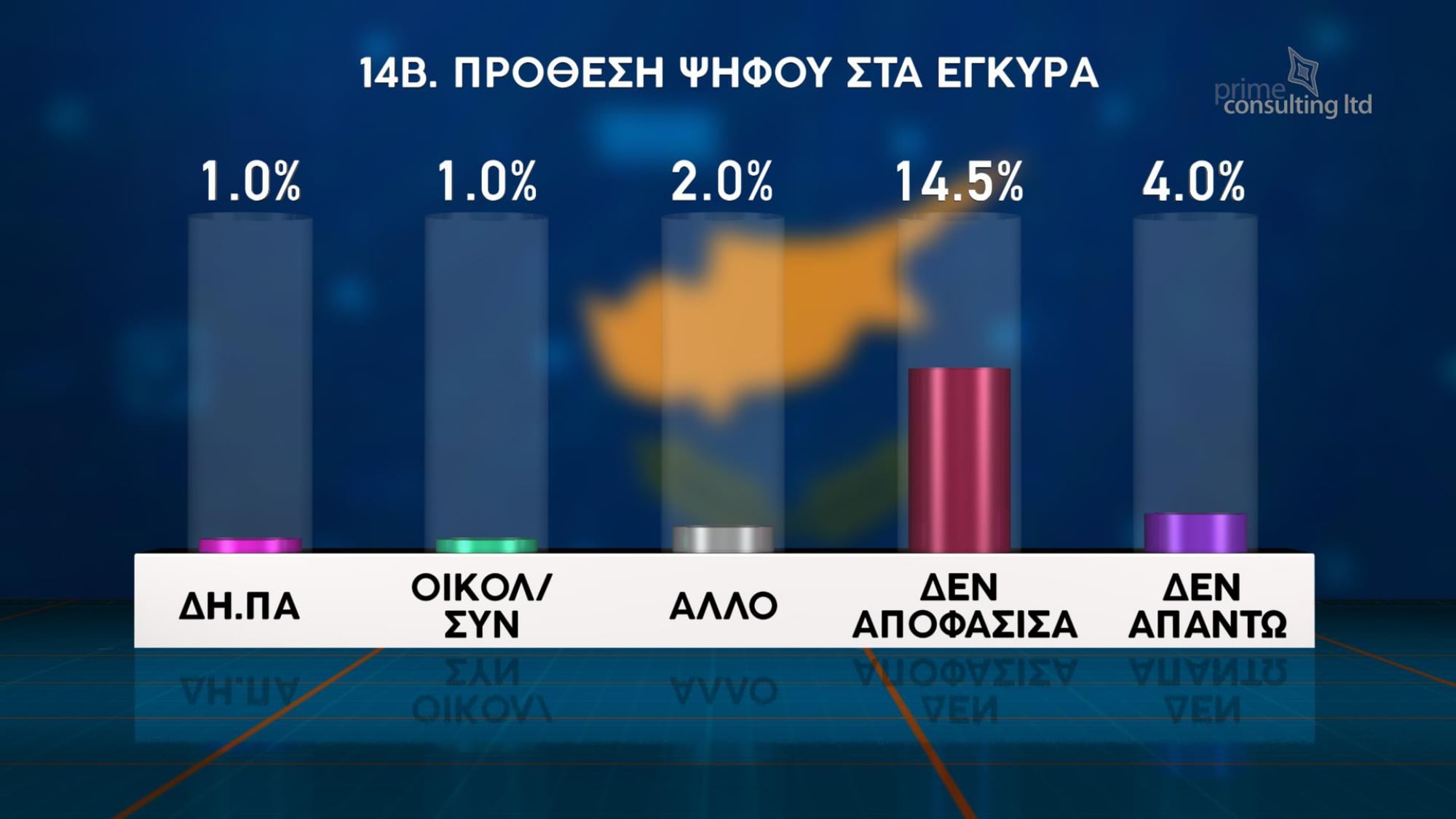 Ωστόσο, στην πρόθεση ψήφου επί των εγκύρων καταγράφεται απόλυτο ντέρμπι. ΔΗΣΥ και ΑΚΕΛ ισοψηφούν στο 18,5%, με το ΕΛΑΜ να ακολουθεί στο 11%. Στην τέταρτη θέση βρίσκεται το ΑΛΜΑ με 9,5%, ενώ ΔΗΚΟ και Άμεση Δημοκρατία καταγράφουν από 7,5%. Το Volt λαμβάνει 3%, η ΕΔΕΚ 2%, ενώ ΔΗΠΑ και Οικολόγοι/Συνεργασία Πολιτών από 1%. Την ίδια στιγμή, το 14,5% δηλώνει αναποφάσιστο και 4% δεν απαντά.