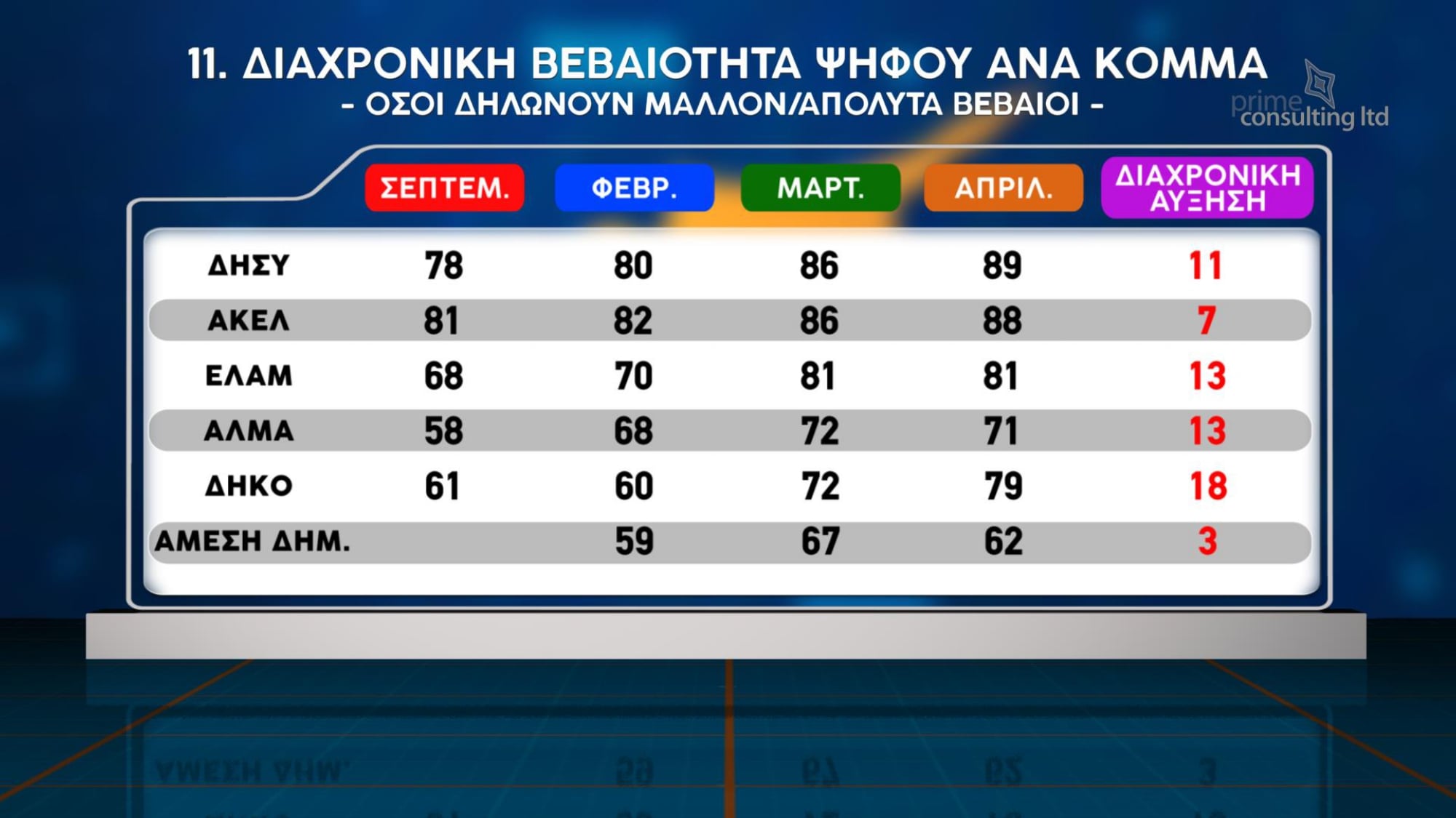 Σε σύγκριση με τον Μάρτιο, ο ΔΗΣΥ ενισχύεται από 18% σε 18,5%, το ΑΚΕΛ από 18% επίσης σε 18,5%, το ΕΛΑΜ υποχωρεί από 12% σε 11%, το ΑΛΜΑ από 10% σε 9,5%, ενώ σημαντική άνοδο παρουσιάζει η Άμεση Δημοκρατία από 5% σε 7,5%. Το ΔΗΚΟ ανεβαίνει επίσης από 7% σε 7,5%.