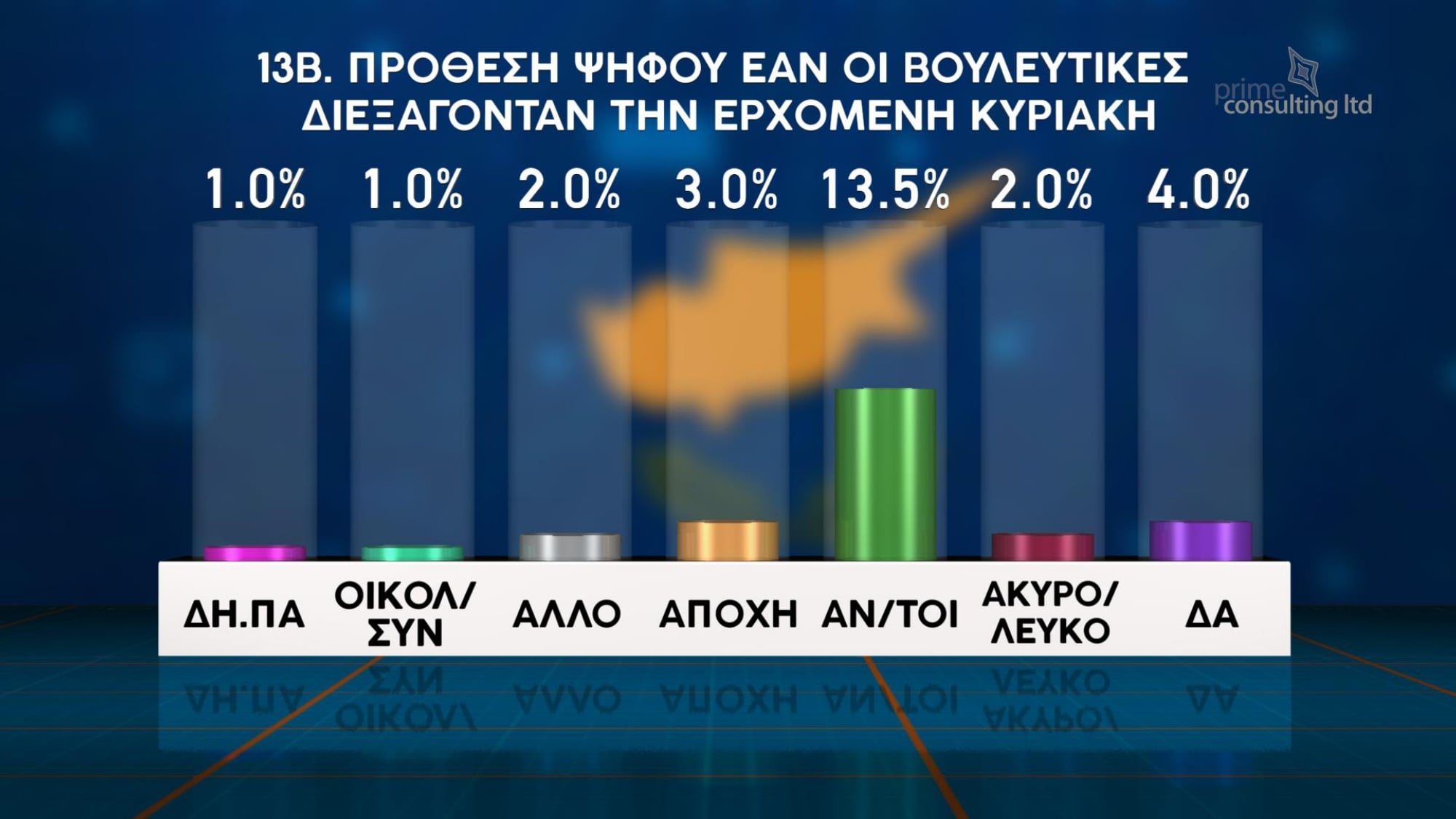 Η νέα δημοσκόπηση της Prime Consulting για την εκπομπή «Χωρίς Περιστροφές», με δείγμα 1.094 ατόμων και περίοδο συλλογής στοιχείων 14 έως 17 Απριλίου 2026, αποτυπώνει ένα πολιτικό σκηνικό έντονης απογοήτευσης, χαμηλής ικανοποίησης προς την κυβέρνηση και αμφίρροπη μάχη κορυφής μεταξύ ΔΗΣΥ και ΑΚΕΛ.