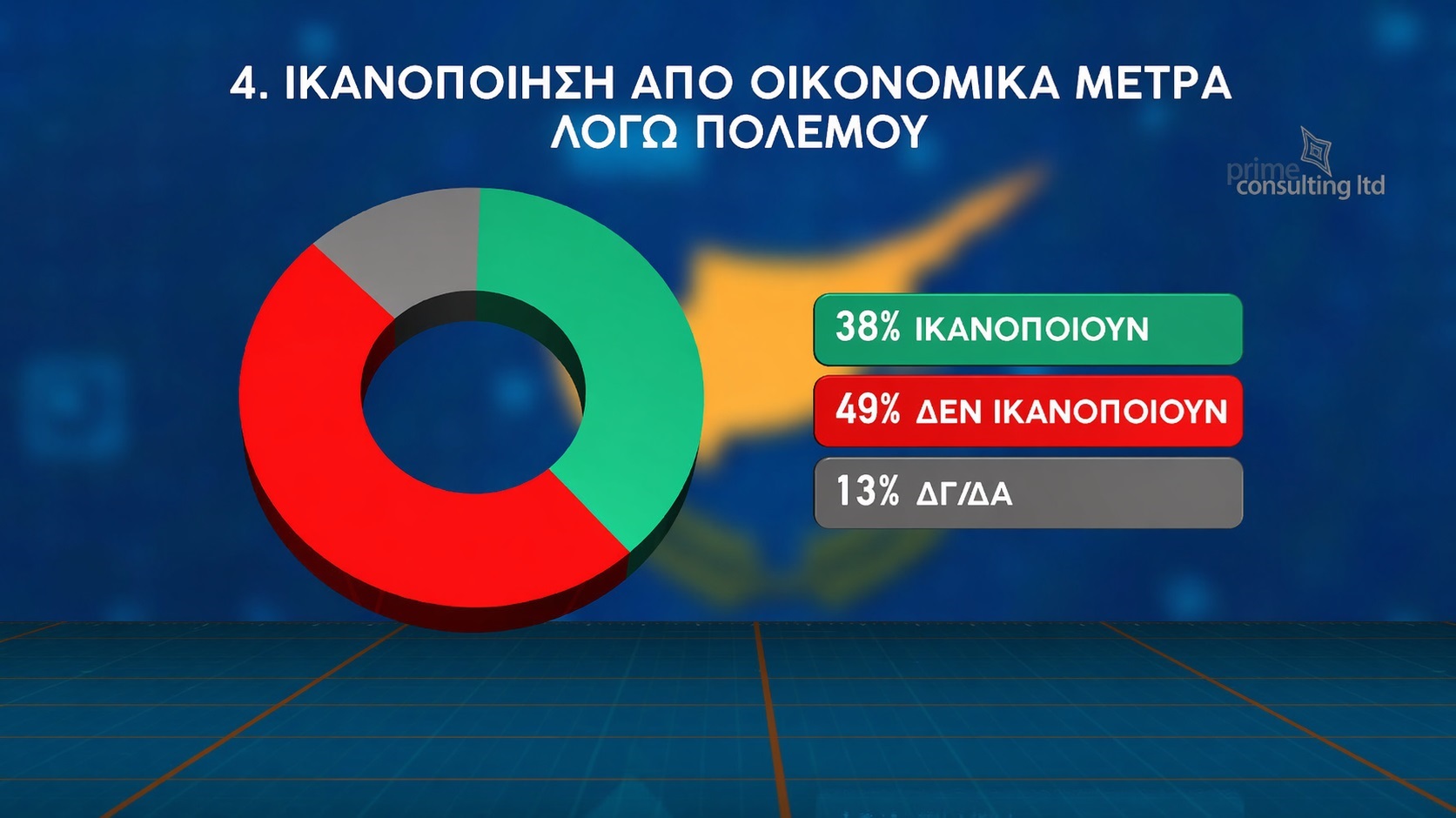 Ανάλογη εικόνα προκύπτει και για τα οικονομικά μέτρα λόγω πολέμου. Το 49% δηλώνει ότι δεν ικανοποιείται, έναντι 38% που δηλώνει ικανοποιημένο, ενώ 13% δεν εκφράζει γνώμη. Μεταξύ όσων απορρίπτουν τα μέτρα, το 24% ζητά μείωση τιμών και φόρων, το 22% περισσότερα μέτρα και το 15% πιο ουσιαστικές παρεμβάσεις.