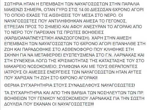 Σύμφωνα με ανάρτηση του Επαρχιακού Ναυαγοσωστικού Ομίλου Λεμεσού, γύρω στις 2 το μεσημέρι ναυαγοσώστες αντιλήφθηκαν ότι το παιδί έχασε τις αισθήσεις του, έτρεξαν προς το μέρος και το ανέσυραν στη στεριά.