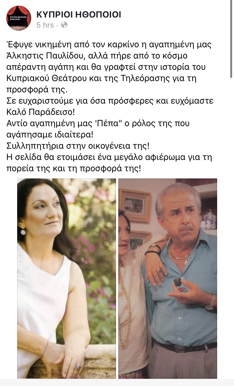 «Έφυγε νικημένη από τον καρκίνο η αγαπημένη μας Άλκηστις Παυλίδου, αλλά πήρε από το κόσμο απέραντη αγάπη και θα γραφτεί στην ιστορία του Κυπριακού Θεάτρου και της Τηλεόρασης για τη προσφορά της.