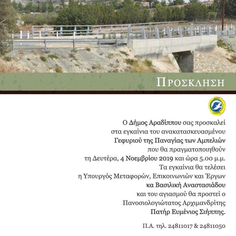 Τα εγκαίνια του ανακατασκευασμένου γεφυριού της Παναγίας των Αμπελιών θα πραγματοποιήσει ο Δήμος Αραδίππου, τη Δευτέρα, 4 Νοεμβρίου 2019 και ώρα 5.00 μ.μ. Τα εγκαίνια θα τελεσθούν από την ΄Εντιμη Υπουργό Μεταφορών, Επικοινωνιών και ΄Εργων κα Βασιλική Αναστασιάδου και του αγιασμού θα προστεί ο Πανοσιολογιώτατος Αρχιμανδρίτης Πατήρ Ευμένιος Σιήππης.