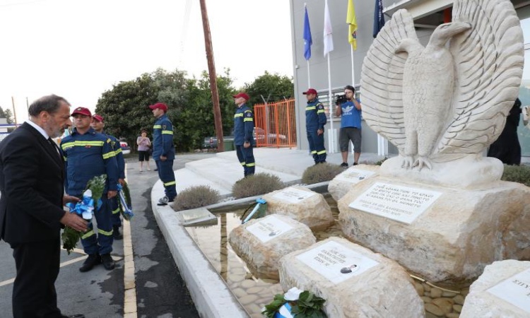 Πρόσθεσε ότι «και τα έξι παλικάρια -πυροσβέστες της ΕΜΑΚ είναι ήρωες, που έγιναν «φάροι» σε ένα «μαύρο» πρωινό. Σε ένα ξημέρωμα Δευτέρας όπου η Κύπρος είδε το σκοτάδι και την καταστροφή. Η Ναυτική Βάση «Ευάγγελος Φλωράκης» γίνεται κρανίου τόπος καθώς ισοπεδώνεται από τρεις αλλεπάλληλες εκρήξεις, ο ηλεκτροπαραγωγός σταθμός στο Βασιλικό παραδίδεται στις φλόγες και η Κύπρος συγκλονίζεται μαθαίνοντας τα τραγικά μαντάτα, 13 λεβέντες, έξι της Πυροσβεστικής Υπηρεσίας και επτά της Εθνικής Φρουράς «έφυγαν» εν ώρα καθήκοντος και εν καιρώ ειρήνης σε εντεταλμένη, για την πατρίδα, υπηρεσία».