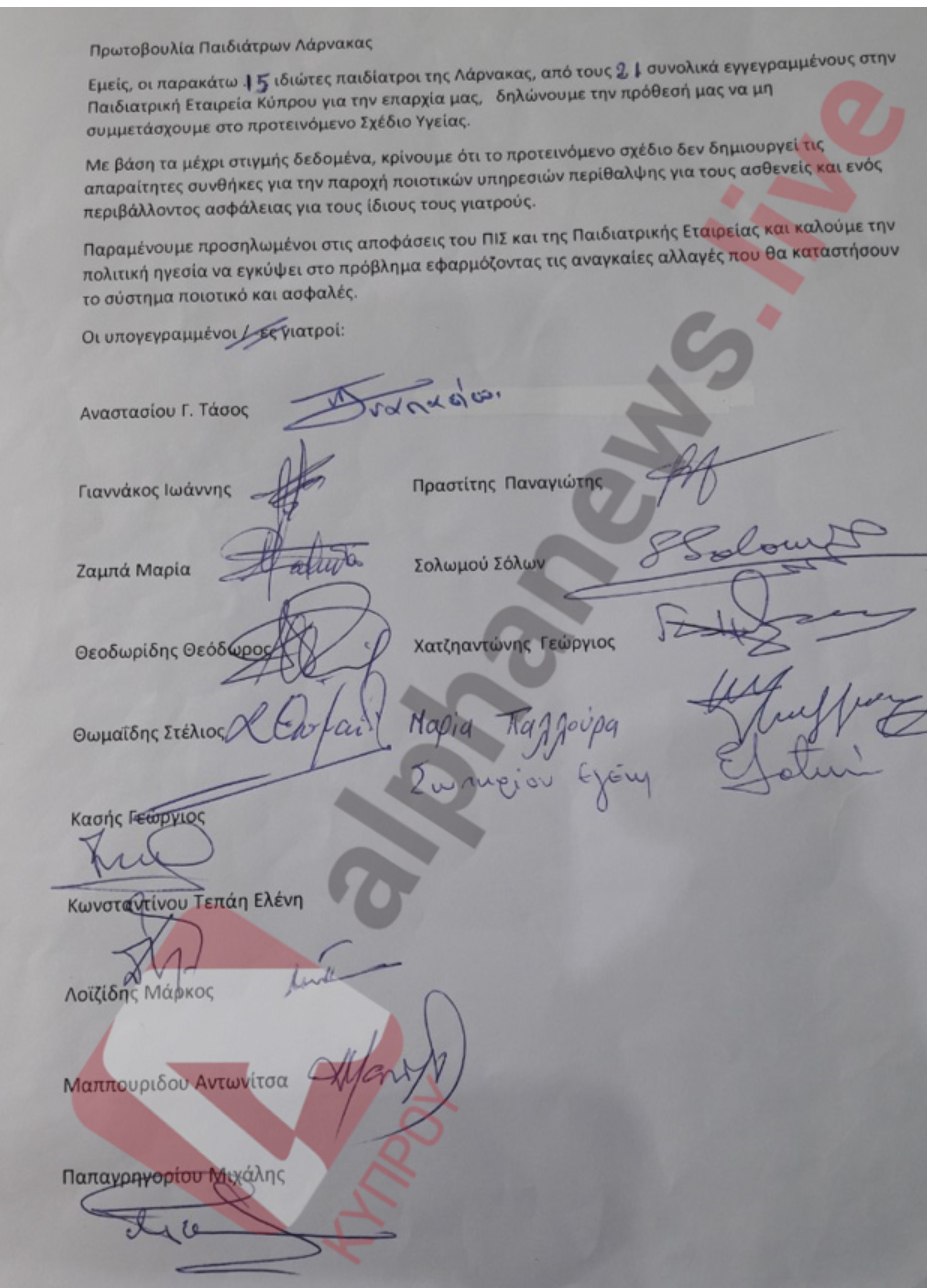 Όπως αναφέρουν στην ανακοίνωση τους οι 15 από τους 21 παιδιάτρους της Επαρχίας Λάρνακας, δεν επιθυμούν να συμμετάσχουν στο προτεινόμενο σχέδιο Υγείας. Μάλιστα όπως αναφέρουν στην ανακοίνωση: