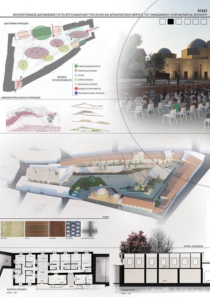 Το οικοδομικό σύμπλεγμα Ζουχουρί, που αποτελείται από την αυλή, τις περιμετρικές οικοδομές, το τέμενος και την πρώην τ/κ Αγορά, βρίσκεται στο αστικό κέντρο της πόλης και είναι ένα από τα σημαντικότερα αρχαία μνημεία της Λάρνακας. Το έργο περιλαμβάνει την ανάπλαση της αυλής, συμπεριλαμβανομένου του χώρου της πρώην τ/κ Αγοράς, τη συντήρηση και αποκατάσταση του ξενώνα που βρίσκεται στον όροφο των οικοδομών παρά το τέμενος, καθώς επίσης τη συντήρηση και αποκατάσταση των όψεων όλων των οικοδομών του συμπλέγματος, από την πλευρά της αυλής. Σκοπός του έργου είναι η λειτουργική και η αισθητική βελτίωση του χώρου και των οικοδομών του συμπλέγματος και η λειτουργική σύνδεση της αυλής με τον περιβάλλοντα χώρο και το οδικό δίκτυο της περιοχής. Στο επίκεντρο του σχεδιασμού είναι η διαμόρφωση της αυλής να γίνει με τέτοιον τρόπο ώστε να αναδεικνύει τον ιστορικό και παραδοσιακό χαρακτήρα του χώρου, του τεμένους και των οικοδομών και να προσελκύει τόσο τους κατοίκους της Λάρνακας, όσο και τους ξένους επισκέπτες.