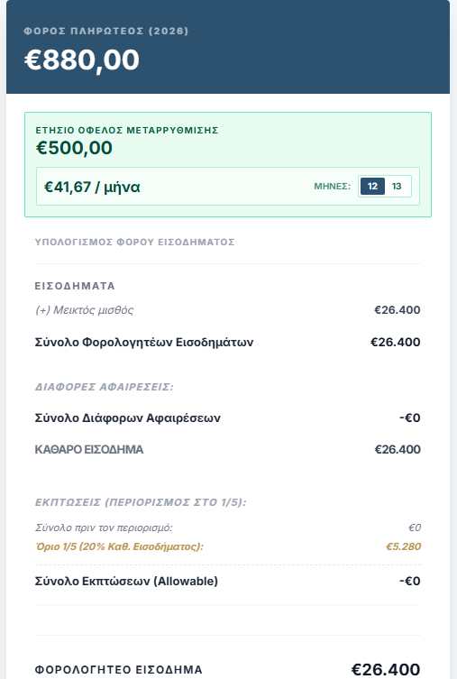 - του ποσού του φόρου εισοδήματος με βάση το νέο φορολογικό καθεστώς (Φορολογική Μεταρρύθμιση 2026), και