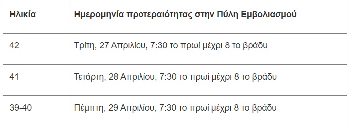 Συγκεκριμένα, την περίοδο 27-29 Απριλίου, η Πύλη Εμβολιασμού θα είναι διαθέσιμη για διευθέτηση ραντεβού ως εξής: