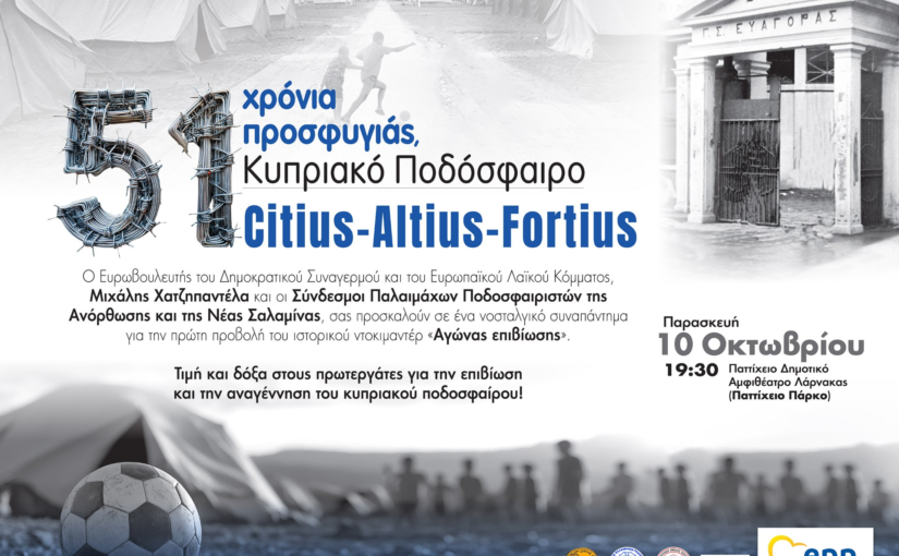 Την Παρασκευή 10 Οκτωβρίου, η ώρα 19:30, στο Παττίχειο Δημοτικό Αμφιθέατρο Λάρνακας, η εκδήλωση «51 Χρόνια Προσφυγιάς, Κυπριακό Ποδόσφαιρο»