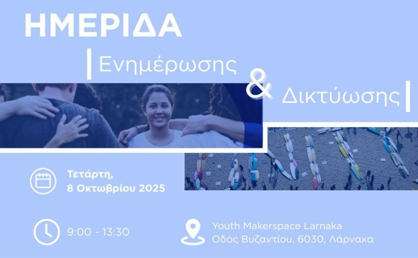 Η εκδήλωση θα πραγματοποιηθεί την Τετάρτη, 8 Οκτωβρίου 2025, 09:00 – 13:30 στο Youth Makerspace Larnaka, Οδός Βυζαντίου, 6030, Λάρνακα και η είσοδος θα είναι ελεύθερη για το κοινό. Για δηλώσεις συμμετοχής, ακολουθήστε το σύνδεσμο https://tinyurl.com/rbvyjj4n.