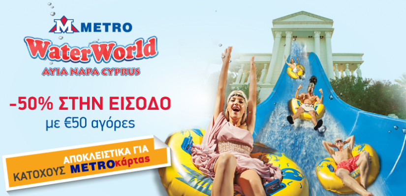 Φέτος το καλοκαίρι όλη η οικογένεια διασκεδάζει στο Waterworld Waterpark στην Αγία Νάπα! Με ψώνια αξίας €50 σε μία απόδειξη, παίρνετε κουπόνι για 4 άτομα, για 50% έκπτωση στην είσοδο για όλη την καλοκαιρινή σεζόν 2019! Καλό καλοκαίρι από τα METRO!