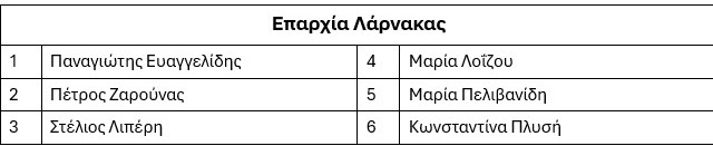 Με την πιο πάνω υποψήφια, συμπληρώνεται το ψηφοδέλτιο της επαρχίας Λάρνακας το οποίο θα αποτελείται από τους πιο κάτω: