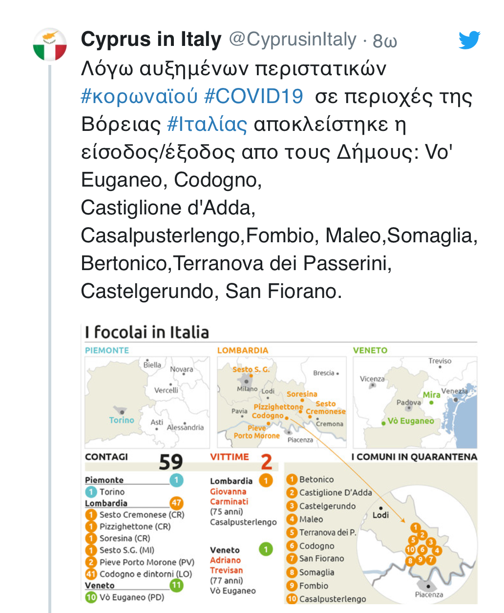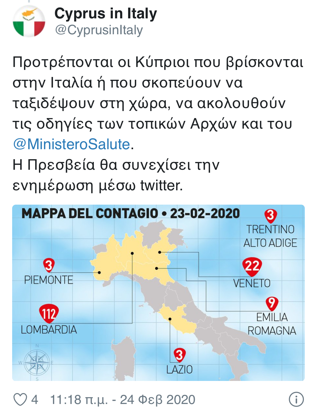 Η σύσταση γίνεται με ανάρτηση της πρεσβείας της Κύπρου στην Ιταλία στο Twitter.