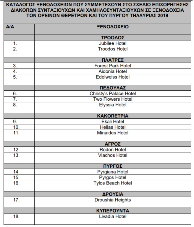 Σημειώνεται πως, όσοι συνταξιούχοι διαμένουν στις περιοχές των ορεινών θερέτρων και του Πύργου Τηλλυρίας, δεν μπορούν να υποβάλουν αίτηση αλλά και ούτε να τύχουν επιχορήγησης των διακοπών τους, ανεξαρτήτως του εάν πληρούν τα κριτήρια για ένταξή τους στο Σχέδιο.