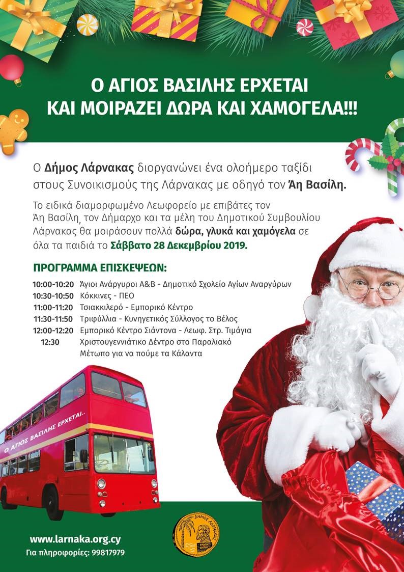 Το ειδικά διαμορφωμένο Λεωφορείο με επιβάτες τον Άη Βασίλη, τον Δήμαρχο και τα μέλη του Διοικητικού Συμβουλίου Λάρνακας θα μοιράσουν πολλά δώρα, γλυκά και χαμόγελα σε όλα τα παιδιά το Σάββατο 28 Δεκεμβρίου 2019.