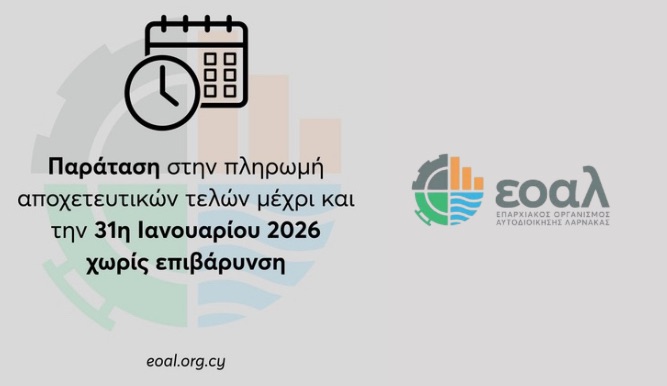 Ο ΕΟΑ Λάρνακας, υπενθυμίζει ότι έχει παραταθεί η πληρωμή των καθορισθέντων και επιβληθέντων αποχετευτικών τελών για το έτος 2025, μέχρι και την 31η Ιανουαρίου 2026 χωρίς επιβάρυνση.
