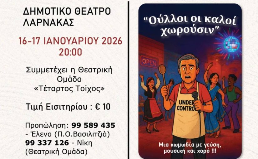 O Πολιτιστικός Όμιλος Βασιλιτζιά με ιδιαίτερη χαρά παρουσιάζει το Χορόδραμα (μουσικοχορευτική κωμωδία) «Ούλλοι οι καλοί χωρούσιν» την Παρασκευή 16 και το Σάββατο 17 Ιανουαρίου 2026 στις 8:00 το βράδυ, στο Δημοτικό Θέατρο Λάρνακας.