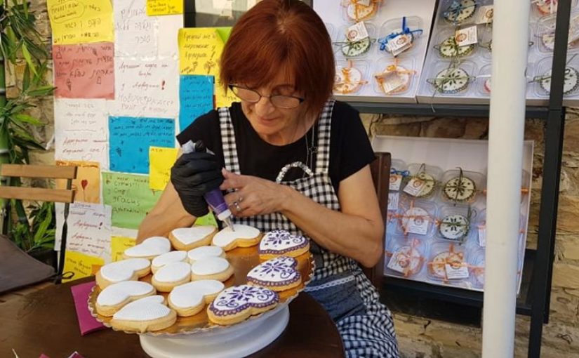 Η ιδιοκτήτρια “κεντά” στην κυριολεξία με ζαχαρόπαστα τα μπισκότα με ευλάβεια και ιδιαίτερη προσοχή για να αποτυπώσει στα σχήματα τα κρόσια, τα κοπτά και τις μαργαρίτες, που πραγματικά βάζει τον πελάτη σε σκέψεις εάν θα πρέπει να τα καταναλώσει ή απλά να τα θαυμάζει…