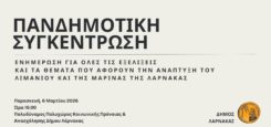 Ο Δήμος Λάρνακας σας προσκαλεί σε Πανδημοτική Συγκέντρωση κατά τη διάρκεια της οποίας θα γίνει ενημέρωση για τις τελευταίες εξελίξεις σχετικά με το Λιμάνι και τη Μαρίνα της πόλης.