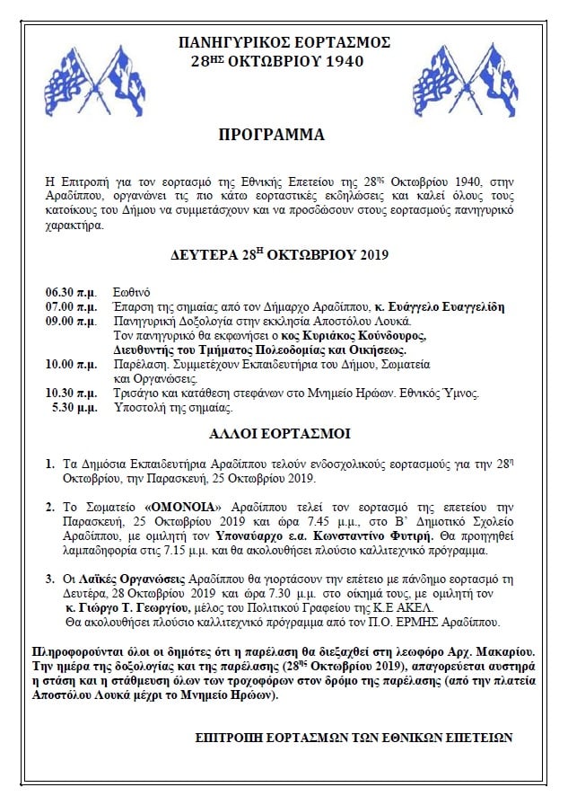 Ο Δήμος Αραδίππου θα γιορτάσει την εθνική επέτειο της 28ης Οκτωβρίου 1940, τη Δευτέρα 28 Οκτωβρίου 2019, στην εκκλησία Αποστόλου Λουκά με πανηγυρική δοξολογία. Η δοξολογία θα γίνει στις 9.00 π.μ. και τον πανηγυρικό της ημέρας θα εκφωνήσει ο κος Κυριάκος Κούνδουρος, Διευθυντής του Τμήματος Πολεοδομίας και Οικήσεως.