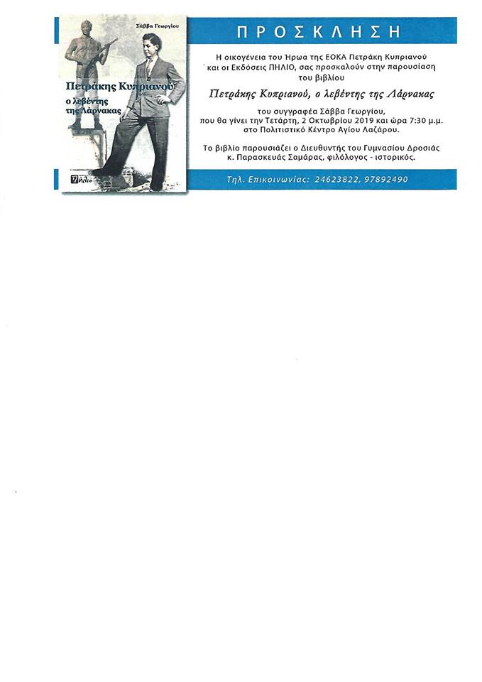 Την Τετάρτη 2 Οκτωβρίου 2019  στις 7:30 μ.μ., θα γίνει η παρουσίαση του βιβλίου του Σάββα Γεωργίου, “Πετράκης Κυπριανού, ο λεβέντης της Λάρνακας”.  Η  παρουσίαση του βιβλίου θα γίνει  στο Πολιτιστικό Κέντρο Αγίου Λαζάρου στη Λάρνακα.