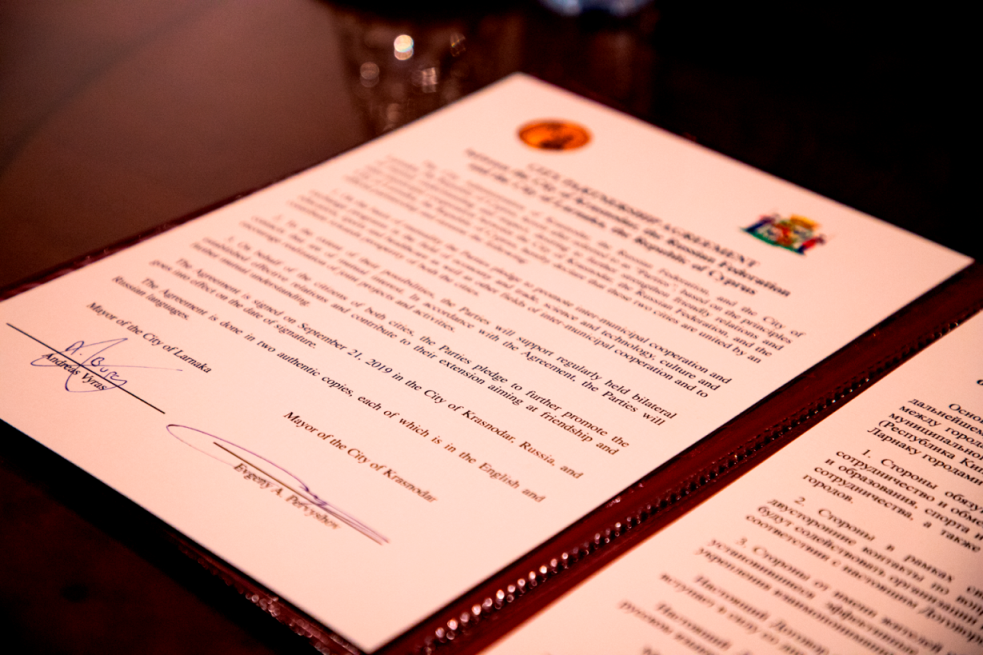 Πραγματοποιήθηκε στις 25 Οκτωβρίου 2019 στις 5.30 μ.μ., η Τελετή της Β’ Φάση Αδελφοποίησης μεταξύ πόλης της  Λάρνακας και της πόλης του Κρασνοτάρ, Ρωσίας.