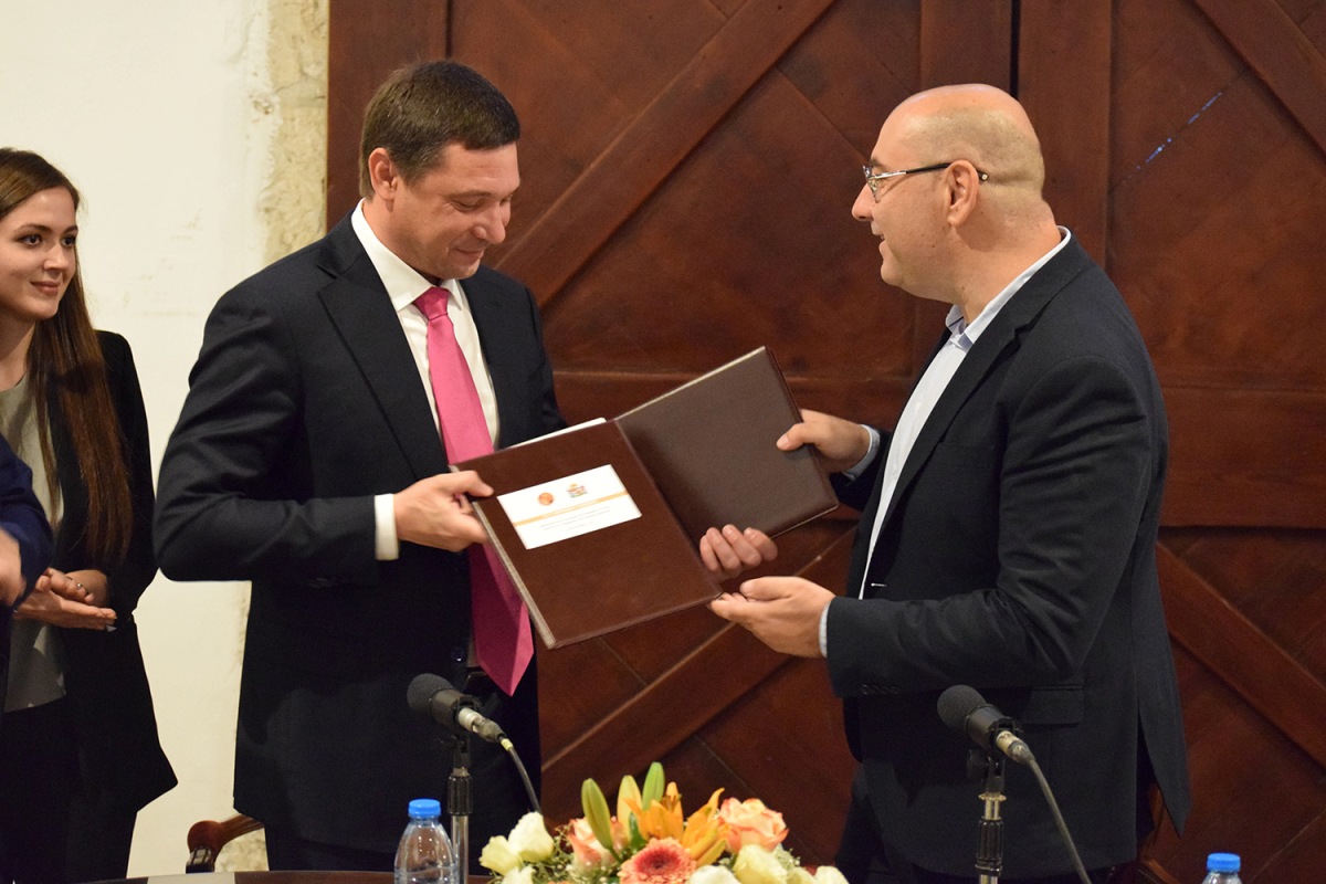 Την χάρτα Αδελφοποίησης υπόγραψαν ο Δημάρχος Λάρνακας και ο Δήμαρχος  του Krasnodar και η Τελετή ολοκληρώθηκε με ανταλλαγή αναμνηστικών δώρων.