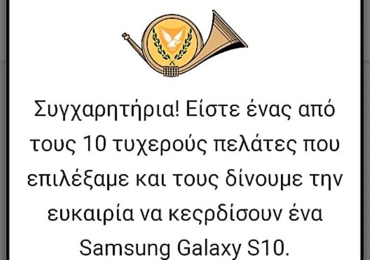 Εάν λάβετε κάποιο μήνυμα στο κινητό σας, με φερόμενο αποστολέα τα Κυπριακά Ταχυδρομεία, σύμφωνα με το οποίο είστε ένας από τους 10 τυχερούς πελάτες που επιλέχθηκαν και σας δίνεται η ευκαιρία να κερδίσετε ένα κινητό τηλέφωνο, αγνοήστε το!