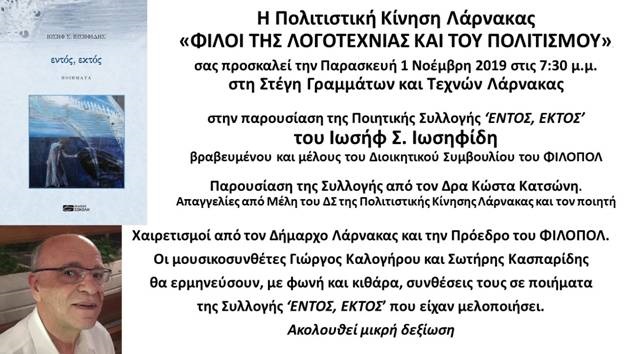 Η Πολιτιστική Κίνηση Λάρνακας «Φίλοι της Λογοτεχνίας και του Πολιτισμού» και η Στέγη Γραμμάτων και Τεχνών Λάρνακας, διοργανώνουν την Παρασκευή 1η Νοεμβρίου 2019 στις 7.30 μ.μ., στη Στέγη Γραμμάτων και Τεχνών, την παρουσίαση της ποιητικής συλλογής «Εντός, εκτός» του Ιωσήφ Σ. Ιωσηφίδη.