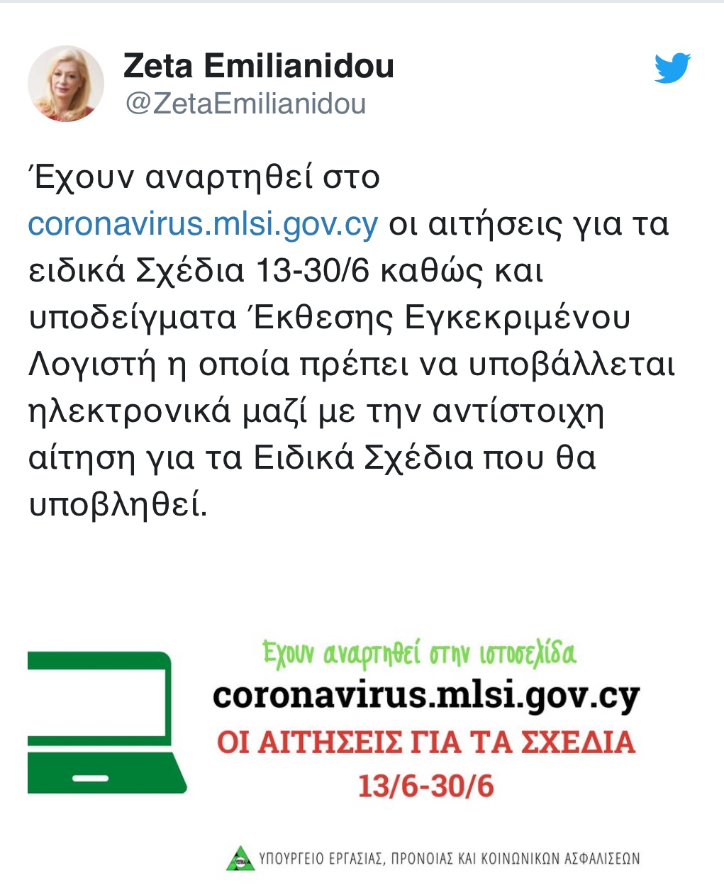 Υπουργείο Εργασίας, Πρόνοιας και Κοινωνικών Ασφαλίσεων ανακοινώνει ότι έχουν αναρτηθεί στην ειδική ιστοσελίδα www.coronavirus.mlsi.gov.cy οι αιτήσεις για όλα τα Ειδικά Σχέδια που αφορούν την περίοδο από 13 Ιουνίου 2020 μέχρι 30 Ιουνίου 2020.