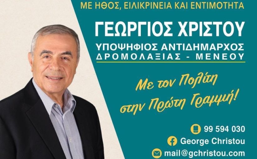 Ο Γιώργος Χρίστου είναι Δημοτικός Σύμβουλος του Δήμου Δρομολαξιάς – Μενεού. Ως μέλος του Δ.Σ. έχει συνεργαστεί με τον Δήμαρχο Κύπρο Ανδρονίκου και συνέβαλε στην παραγωγή έργου στον Δήμο και στην πρόοδο και ανάπτυξη της Δρομολαξιάς και του Μενεού. Ο Γιώργος Χρίστου, εργάστηκε στην Τοπική Αυτοδιοίκηση με εντιμότητα, ήθος και ειλικρίνεια.