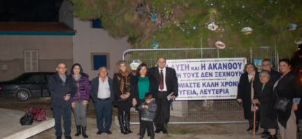 Η κοινή, συμβολική φωταγώγηση του δέντρου που βρίσκεται μεταξύ των προσωρινών γραφείων των προσφυγικών Δήμων Λύσης και Ακανθούς στη Λάρνακα με το σύνθημα “Λύση και Ακανθού τη γη τους δεν ξεχνούν” στέλλει το μήνυμα πως η φλόγα της επιστροφής παραμένει πάντα αναμμένη, αναφέρεται σε δελτίο Τύπου που στάληκε στα ΜΜΕ. Παρόντες στη χθεσινοβραδινή, συμβολική … Continue reading Συμβολική φωταγώγηση δέντρου στα Δημαρχεία Λύσης και Ακανθούς