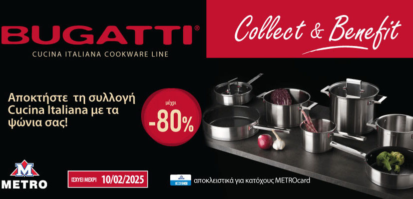 Η σειρά Cucina Italiana της Bugatti με 9 διαφορετικά είδη που περιλαμβάνουν κατσαρόλες, τηγάνια και καπάκια σε διαφορετικά μεγέθη, μπορεί να γίνει δική σας μέχρι και 80% φθηνότερα, συλλέγοντας αυτοκόλλητα με τις αγορές σας στα METRO.
