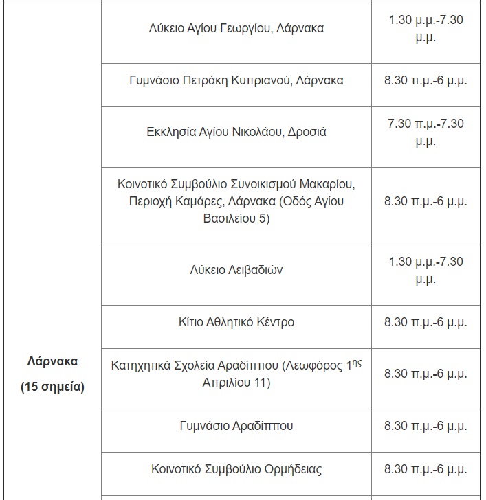 Για την Τετάρτη, 26 Μαΐου, οι μονάδες δειγματοληψίας θα βρίσκονται στις ακόλουθες τοποθεσίες: