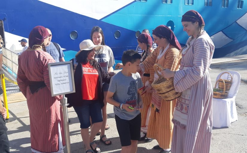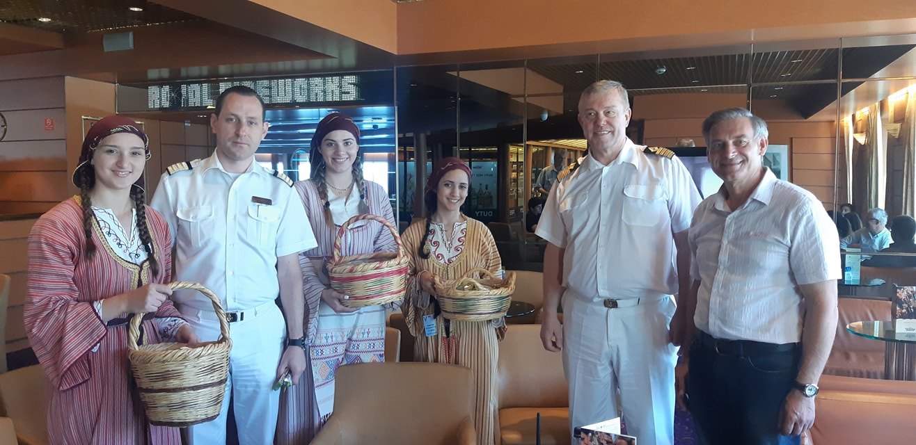Τους τουρίστες και το πλήρωμα του πλοίου υποδέχθηκαν ο Δήμαρχος Λάρνακας, ο Δημοτικός Γραμματέας και η Νανά Ασμένη της Ε.Τ.Α.Π Λάρνακας. Όλοι τους ξεναγήθηκαν στους χώρους του πλοίου και γνώρισαν το πλήρωμα, ενώ οι επισκέπτες είχαν την ευκαιρία να απολαύσουν μια όμορφη παραδοσιακή τελετή από τον Πολιτιστικό Όμιλος Αράδιππος Καροτσέρης και την Accordion Orchestra by Daniel Sabotinov