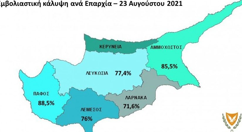 Σχετικά με την εμβολιαστική κάλυψη ανά Επαρχία, όπως φαίνεται και στον χάρτη που επισυνάπτεται, η Πάφος εξακολουθεί να βρίσκεται στην πρώτη θέση με ποσοστό του 88,5% του πληθυσμού της να έχει λάβει τουλάχιστον την 1η δόση. Ακολουθεί η Επαρχία Αμμοχώστου με 85,5% και στη συνέχεια οι Επαρχίες Λευκωσίας και Λεμεσού με 77,4% και 76% αντίστοιχα. Τέλος, το χαμηλότερο ποσοστό εμβολιαστικής κάλυψης έχει η Επαρχία Λάρνακας με 71,6%.